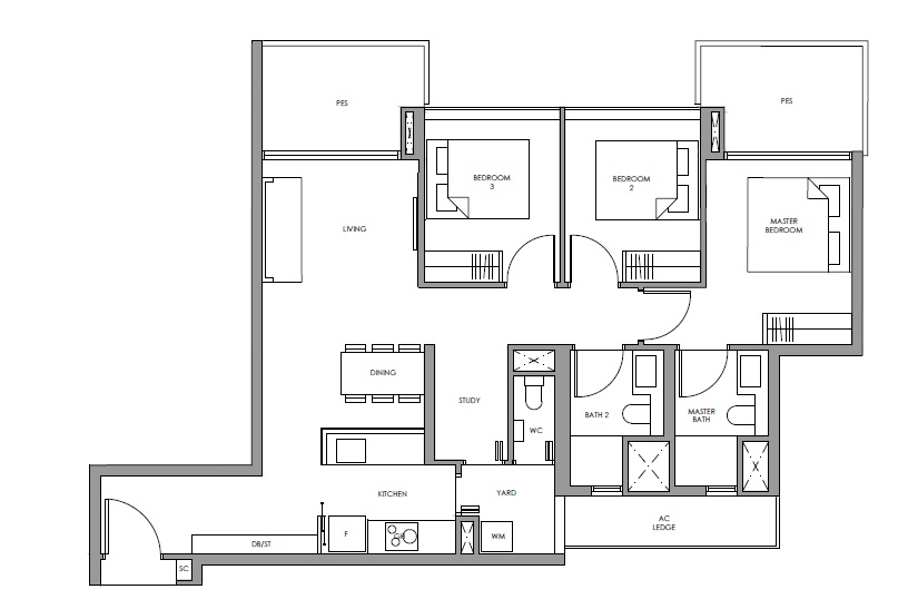 | 3 Bed + Study | 1076 - 1130 | 68 |